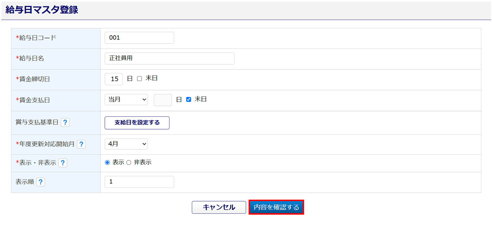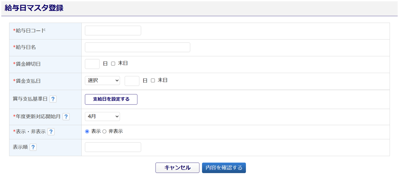 表示・非表示 従業員台帳編集画面「給与日」項目に、選択肢を表示するかを選択します。