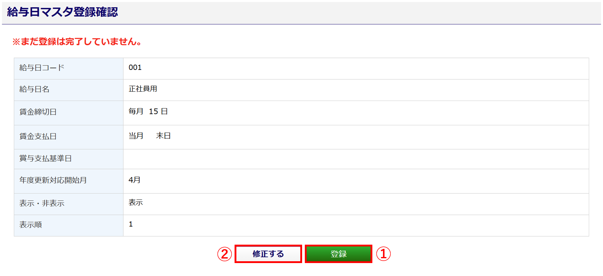 画面上部に「登録しました。」と表示されたら、給与日マスタの登録は完了です。