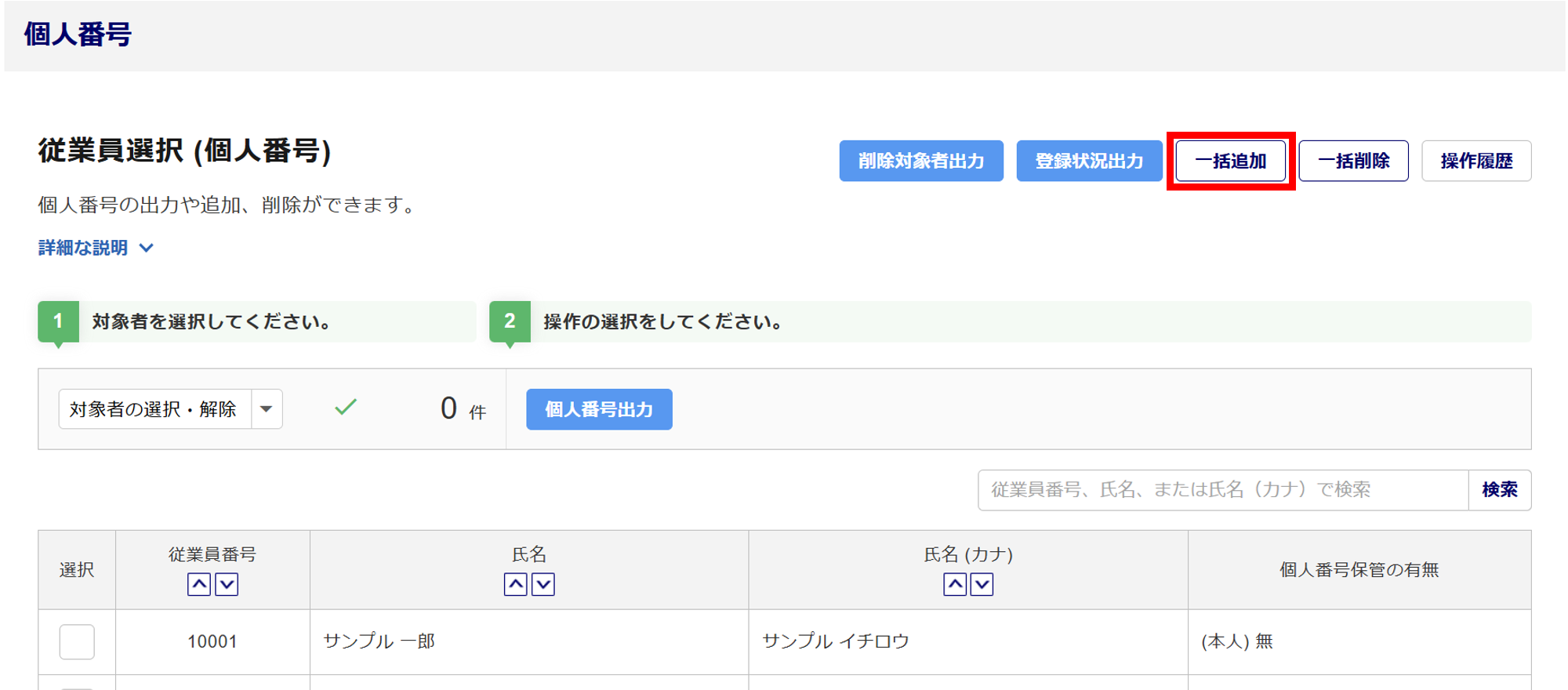 [個人番号]>[出力・一括追加・一括削除]をクリックします。