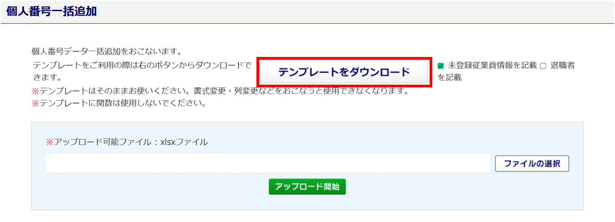 ダウンロードしたテンプレートファイルを開き、J列「個人番号」項目に、個人番号(マイナンバー)を入力します。