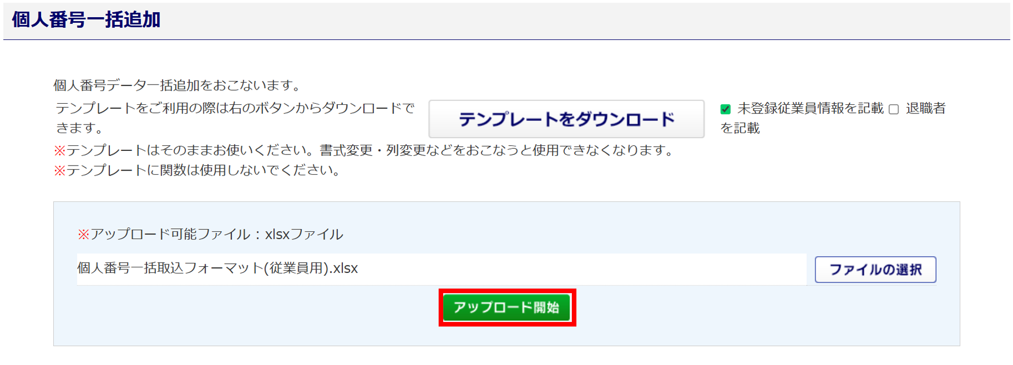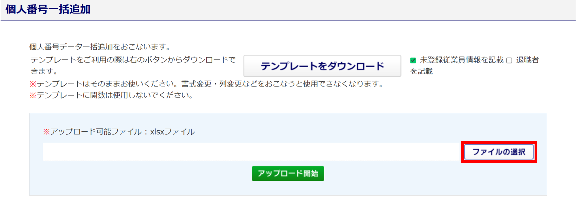 [ファイルの選択]をクリック、個人番号を入力したテンプレートファイルを選択します。