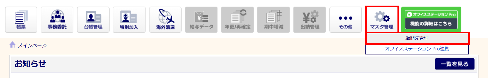 [マスタ管理]をクリックし、表示されるメニュー内の[顧問先管理]をクリックします。