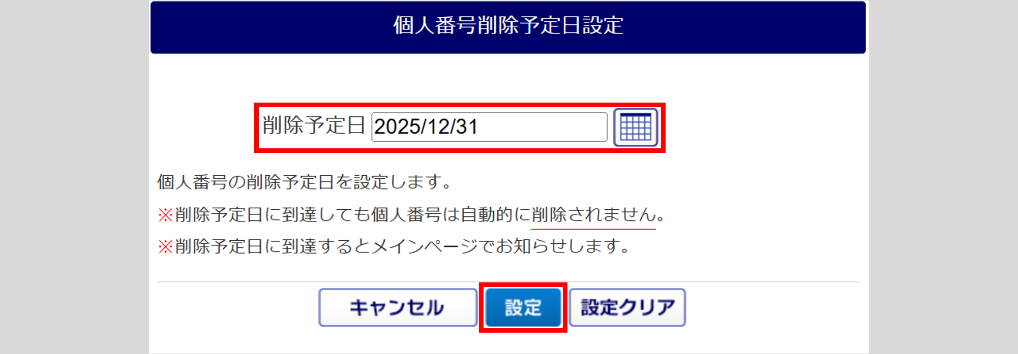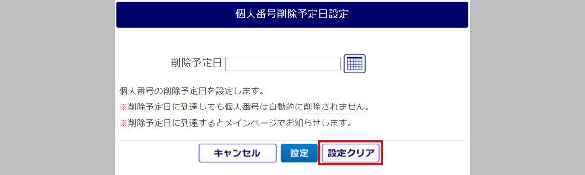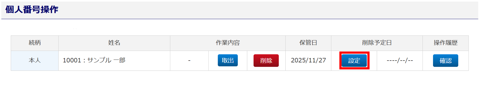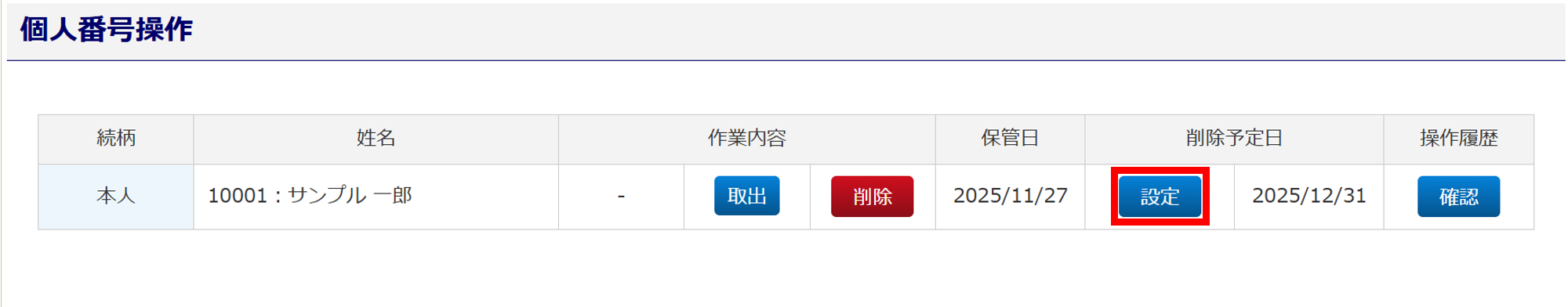 個人番号の「削除予定日」を設定し、[設定]をクリックします。