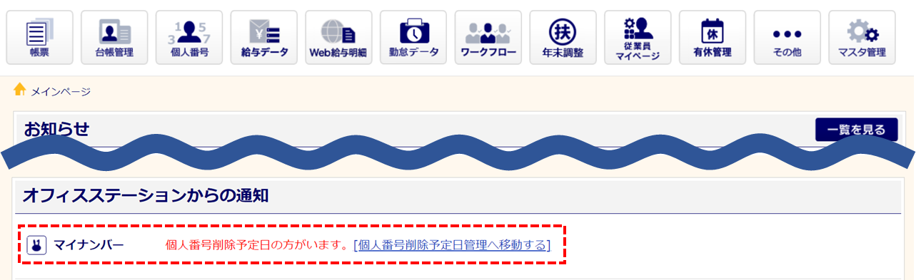 個人番号削除予定日に到達すると、メインページの「オフィスステーションからの通知」欄に通知されます。