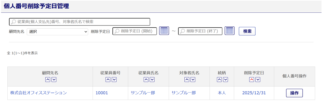 「削除予定日」が到来した際には、手動で個人番号(マイナンバー)の削除操作をおこなってください。