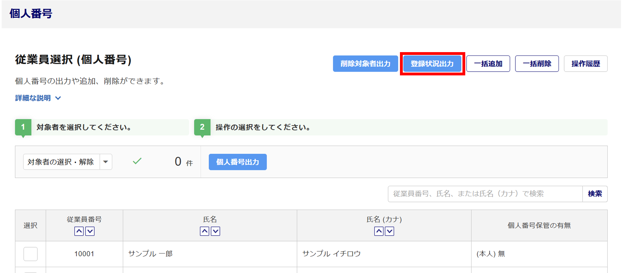 「登録状況出力」では、個人番号(マイナンバー)は出力されません。