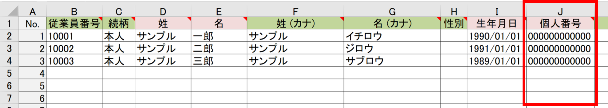 ダウンロードしたテンプレートファイルを開き、A列「削除対象者に1を入力」項目に、個人番号(マイナンバー)を削除する対象者へ「1」を入力します。