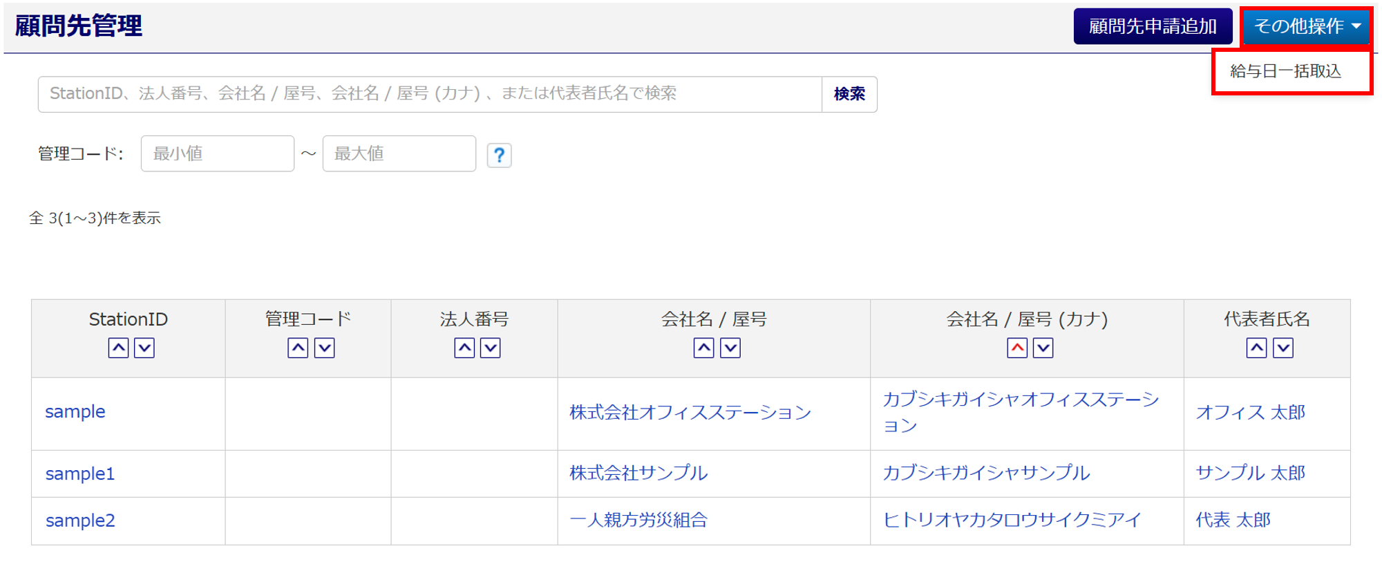 画面右上の[その他操作]をクリックし、表示されるメニュー内の[給与日一括取込]をクリックします。