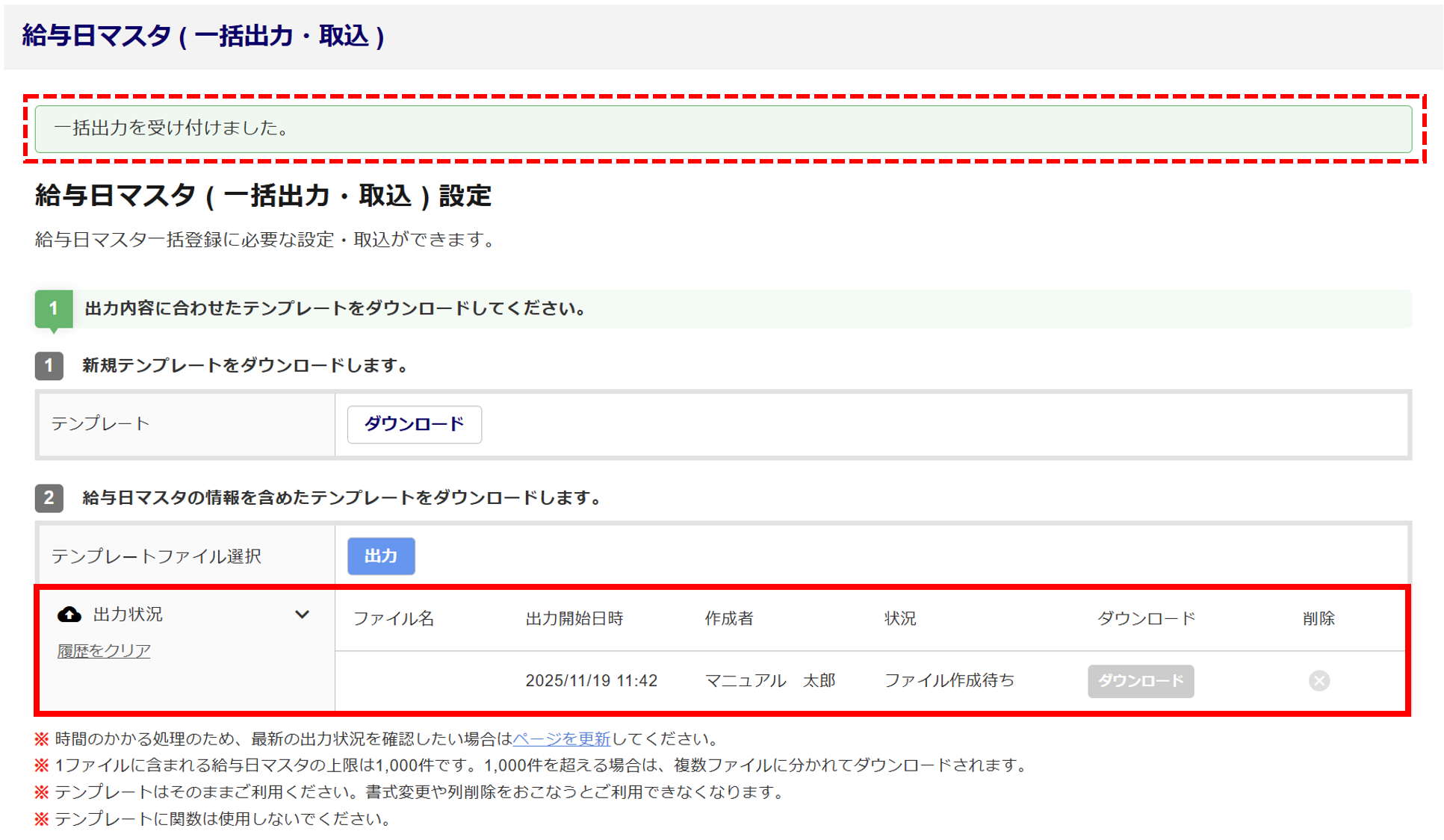 クリック後、画面上部に「一括出力を受け付けました。」と表示され、「テンプレートファイル選択」行の下に「出力状況」欄が表示されます。