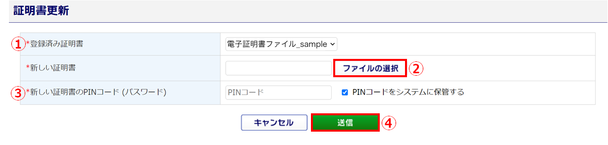 [ファイルの選択](②)をクリックし、新しい電子証明書ファイルを選択します。