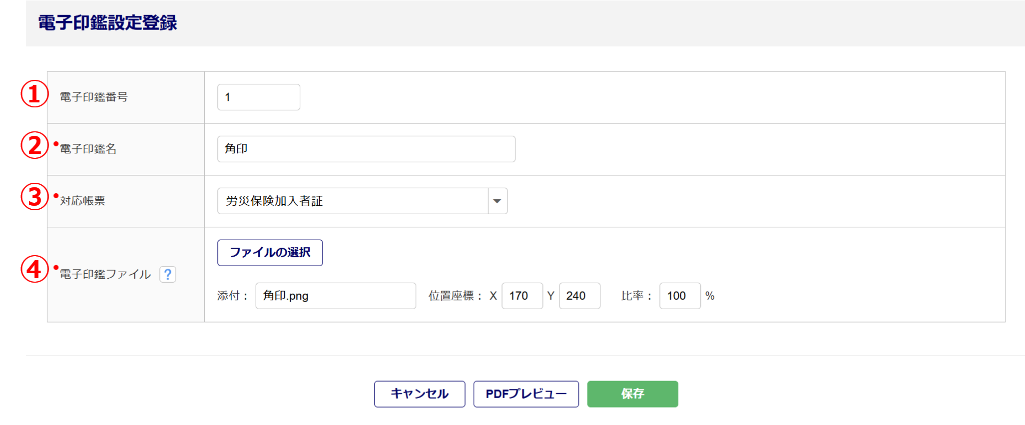 | [ファイルの選択]をクリックし、電子印鑑データをご選択ください。 必須項目のため、省略はできません。 |