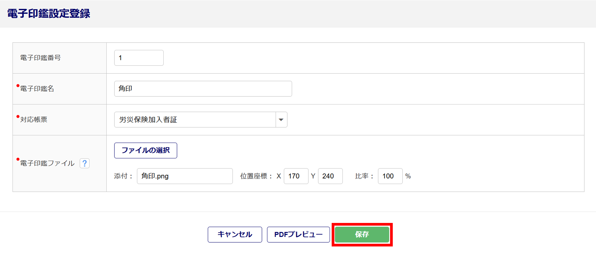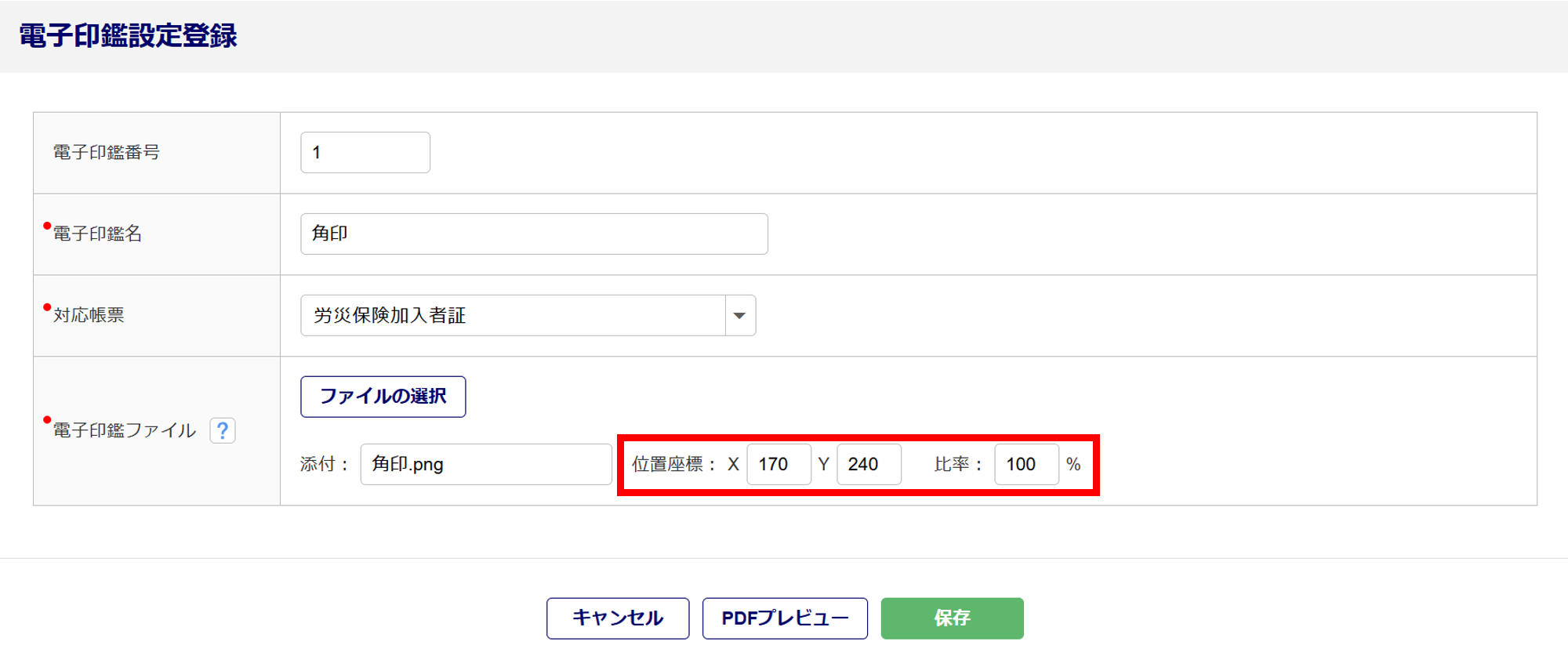 「位置座標」と「比率」を設定し、電子印鑑を反映する位置や大きさを調整します。