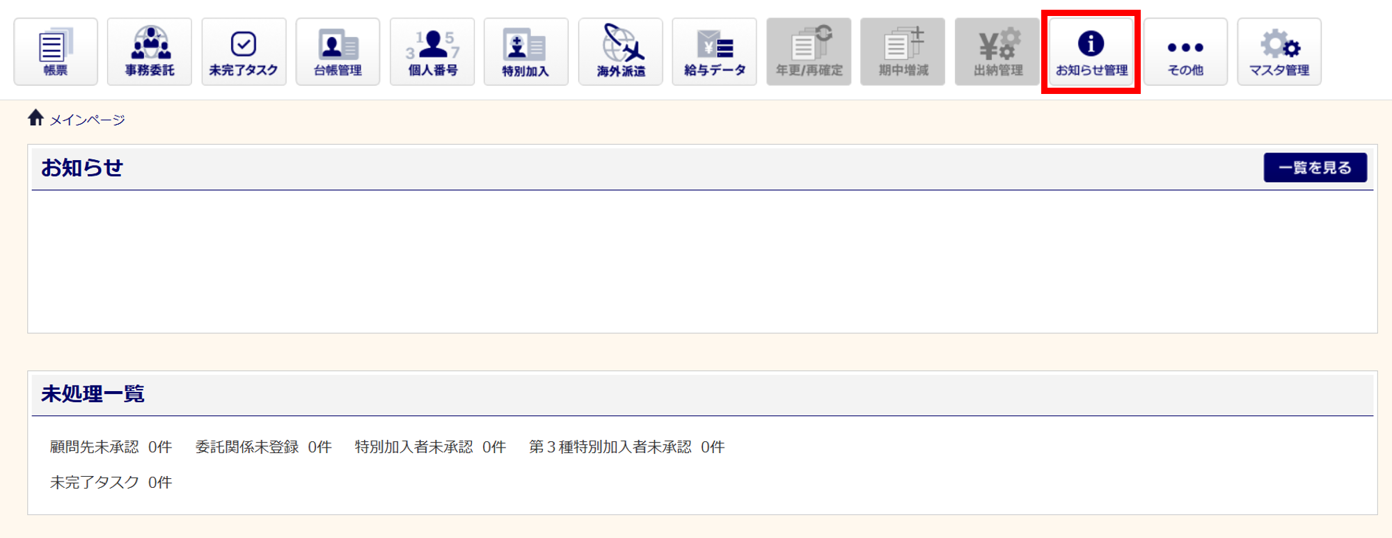 会員社労士へアカウント発行している場合に限り、「お知らせ」を表示できます。