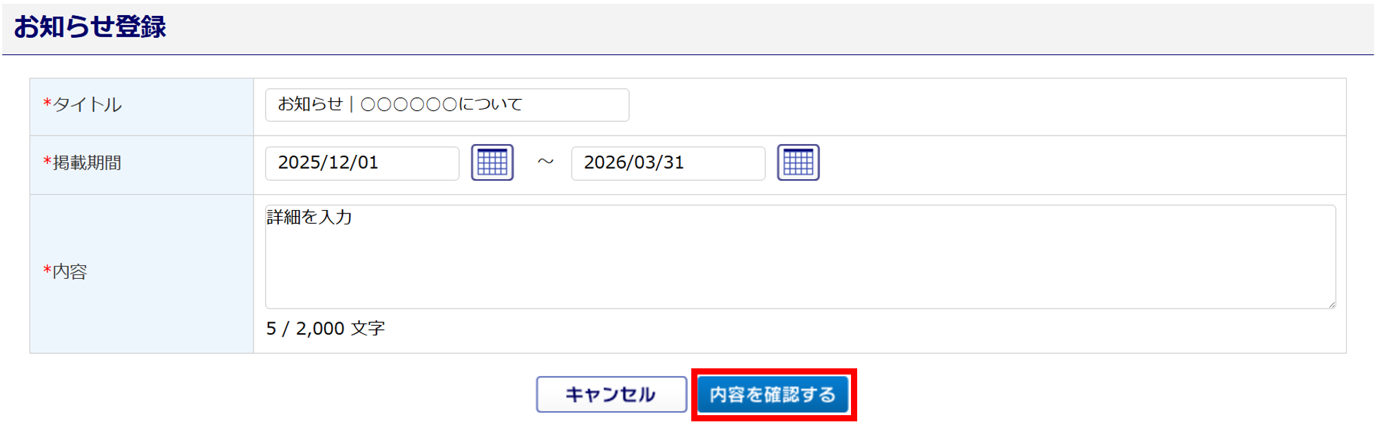 | 案内や、お知らせに関する詳細を入力します。 最大2,000文字まで入力することができます。 |