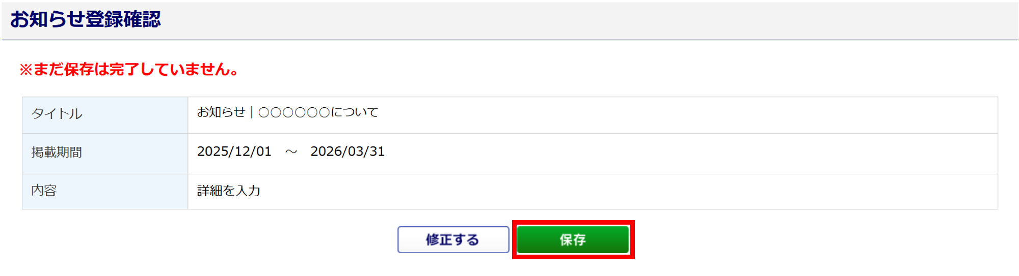 「掲載期間(開始)」を当日に設定した場合、[保存]クリック後すぐにお知らせが公開されます。