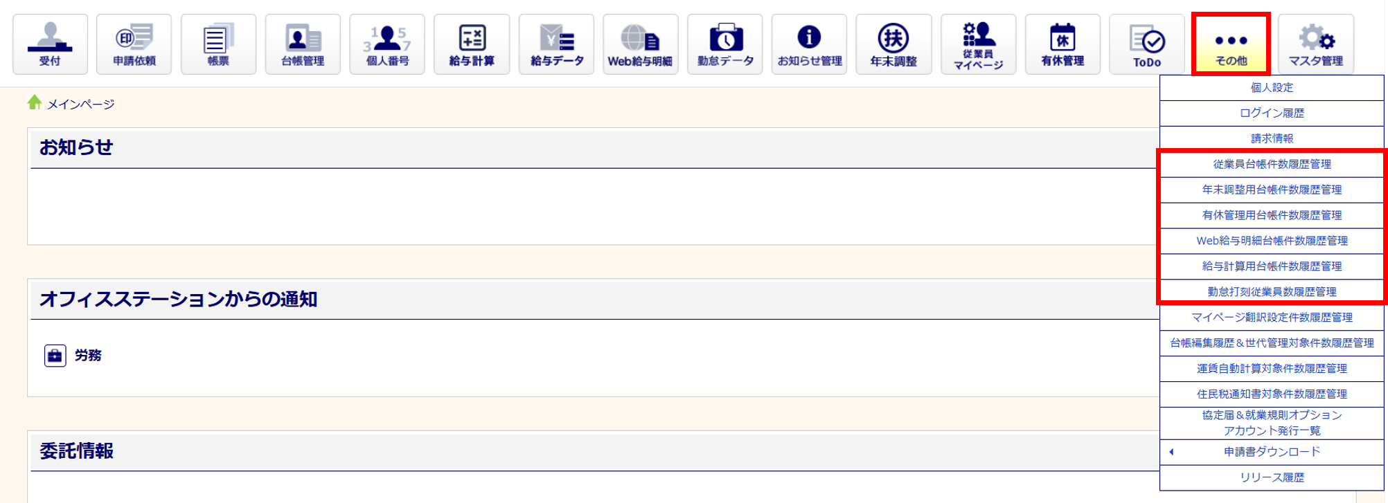 | 公開士業用顧問先手続き利用料 | 「オフィスステーション 労務」をアカウント発行時の料金となります。 「対象従業員数」に入力した人数を請求時に集計します。 |