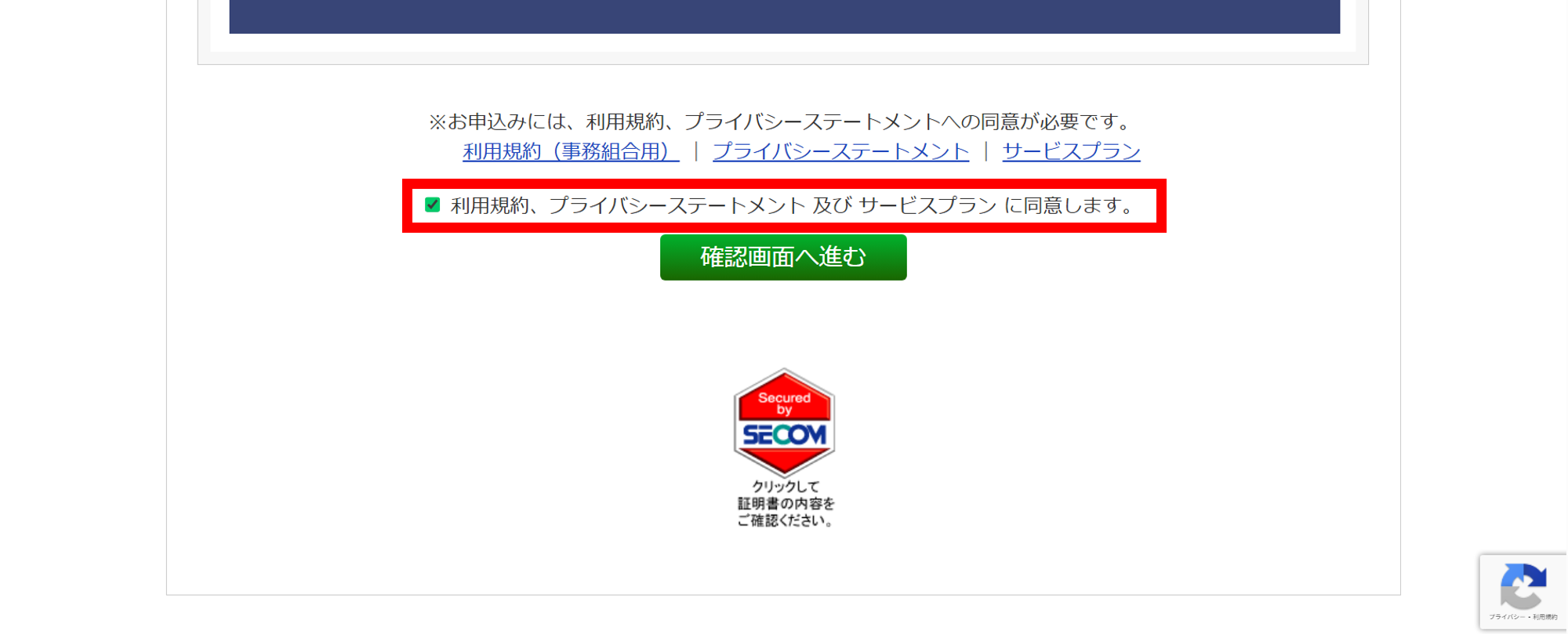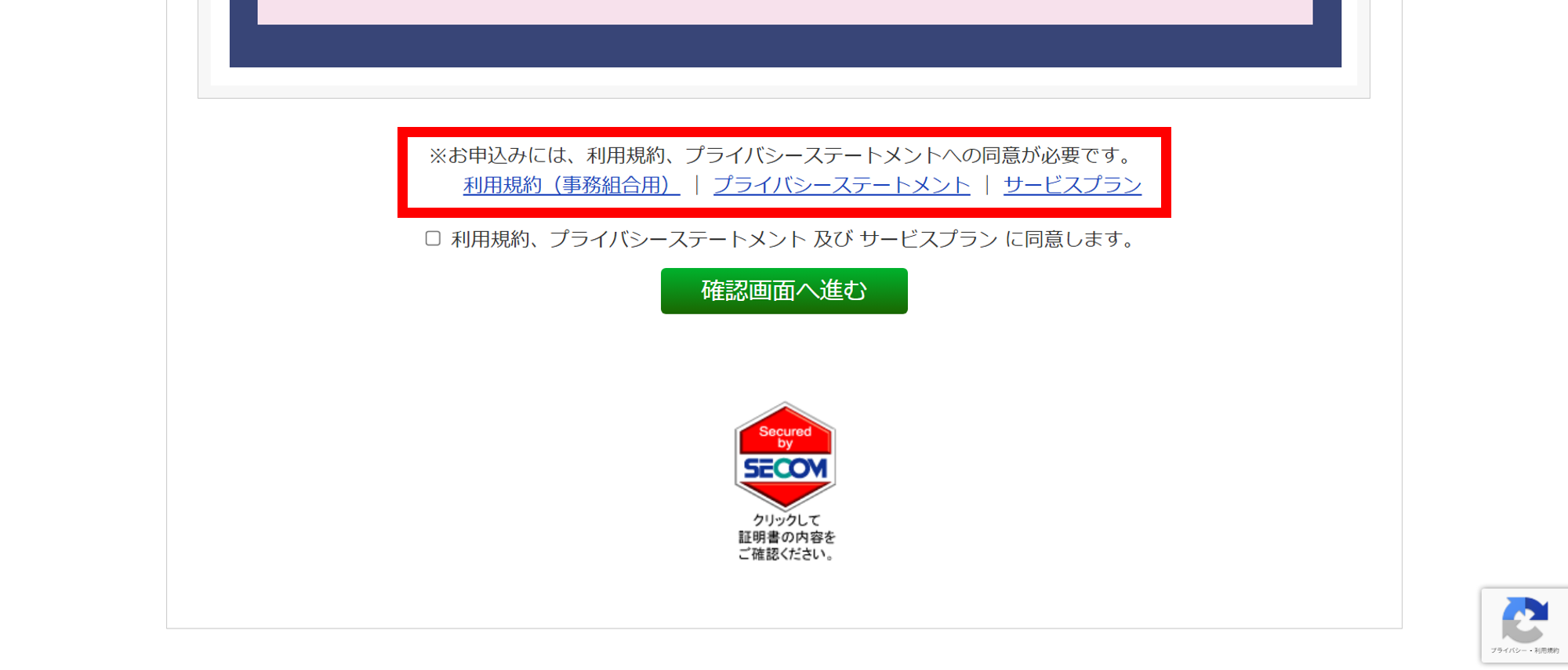 「利用規約(事務組合用)」「プライバシーステートメント」「サービスプラン」をクリックし、内容を確認します。