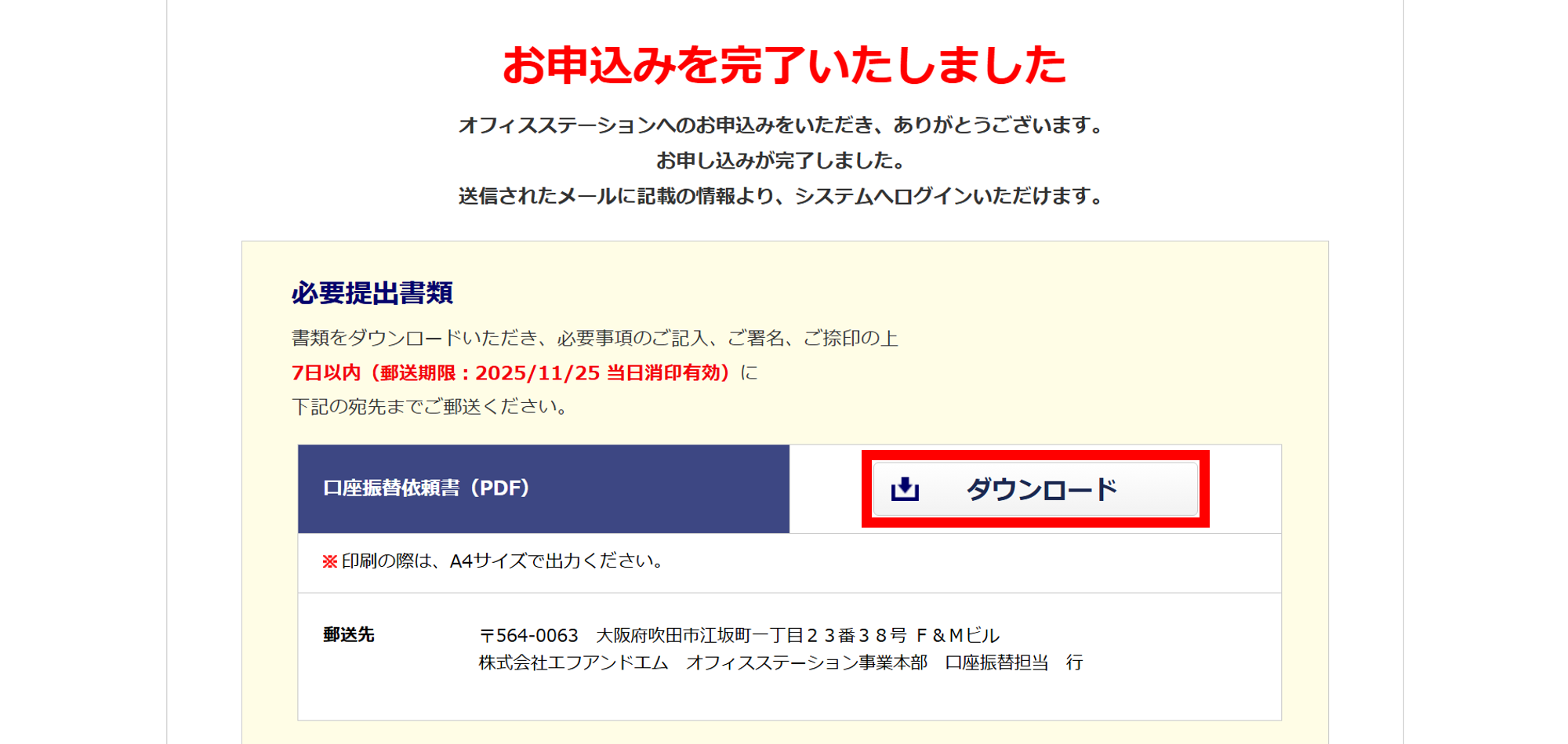 お申込み完了後、7日以内(当日消印有効)に「口座振替依頼書」を弊社へ郵送いただく必要があります。