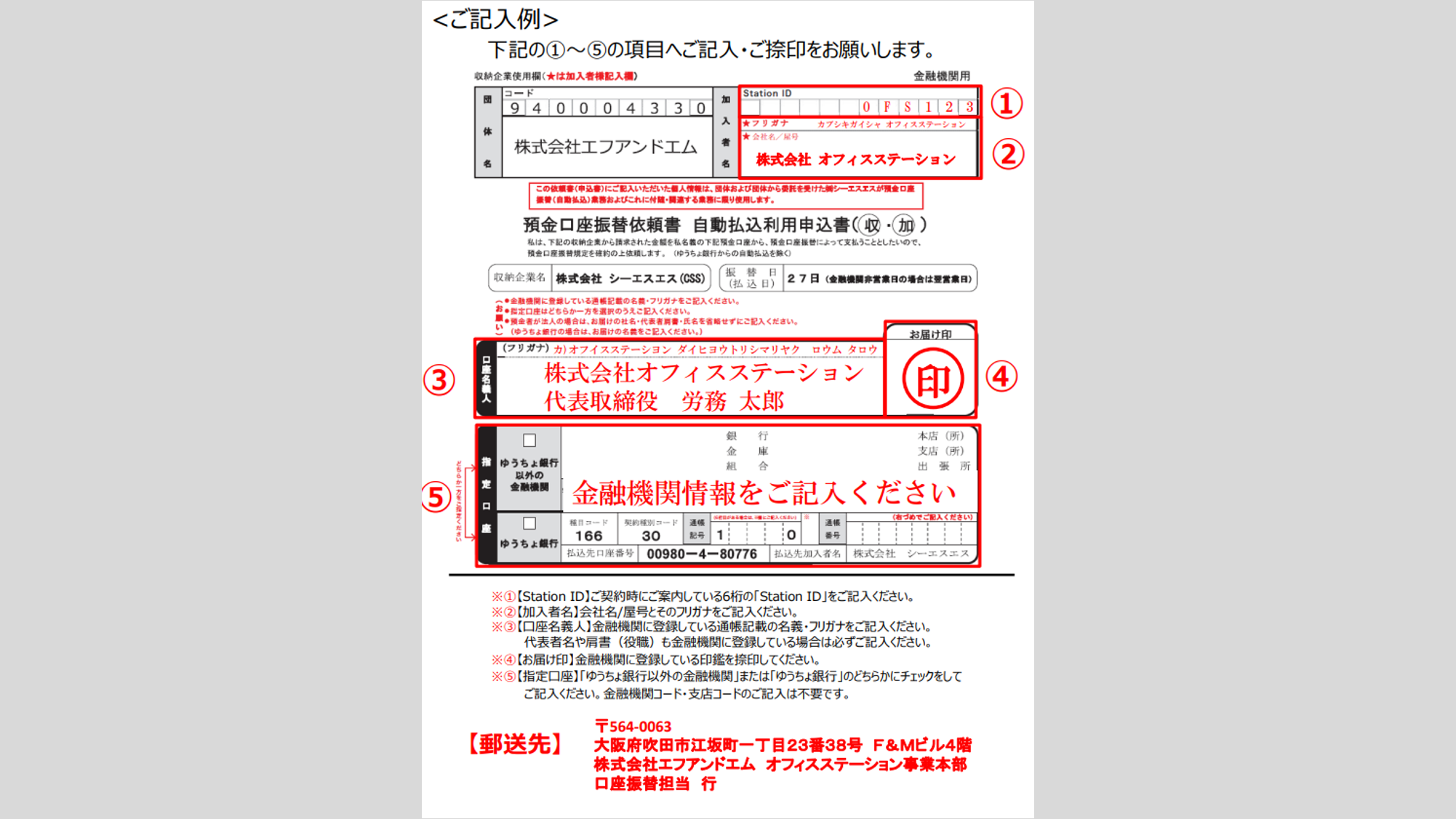 ご記入、捺印いただいた口座振替依頼書を、弊社へご郵送ください。