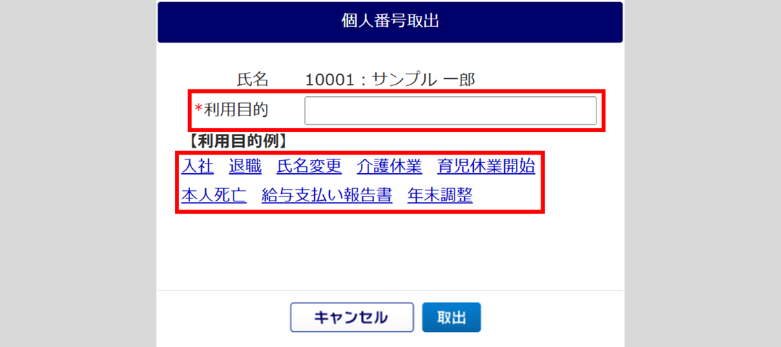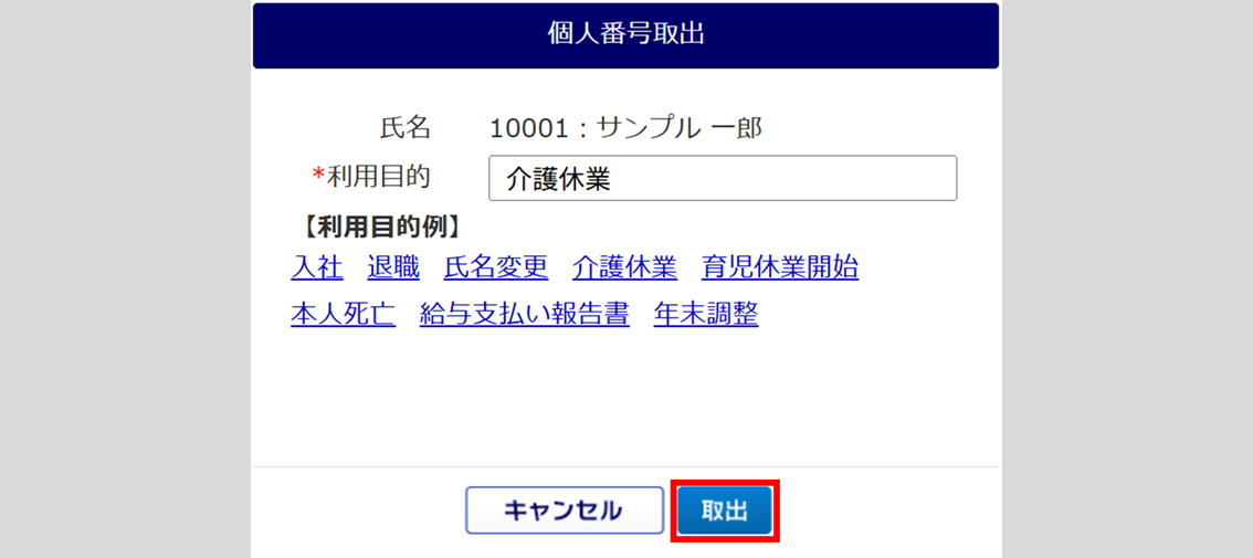 「個人番号取出」画面が表示されます。