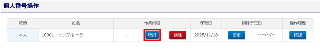 「作業内容」列に[取出][削除]ボタンが表示されておらず、[保管]ボタンが表示されている場合は、個人番号がシステムに保管されておりません。[保管]操作をおこなってください。