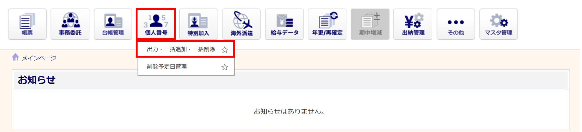 [個人番号]をクリックし、表示されるメニュー内の[出力・一括追加・一括削除]をクリックします。