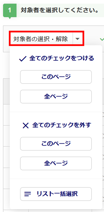 [対象者の選択・解除]をクリックすると、このページや全ページの全てにチェックをつけることができます。