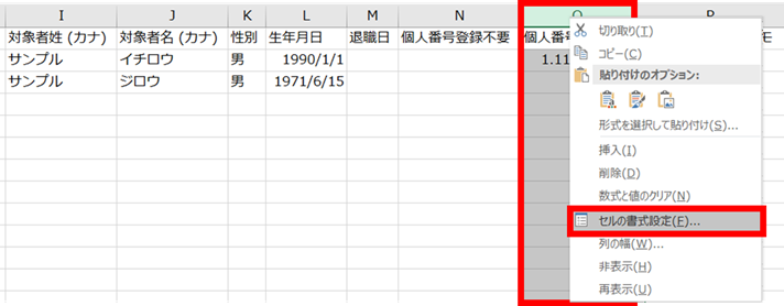 「O列:個人番号」を選択、右クリックし、表示されるメニュー内の[セルの書式設定]をクリックします。