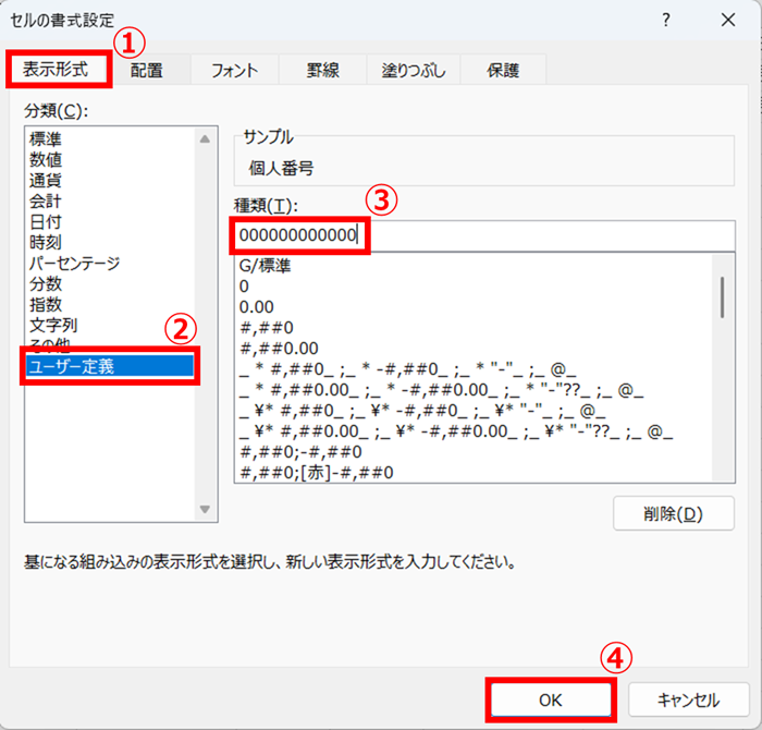 「表示形式」タブ()にて、「分類(C)」に「ユーザー定義」()を選択し、「種類(T)」に「000000000000」(0を12桁)()を入力、[OK]()をクリックすると、個人番号が正しく表示されます。