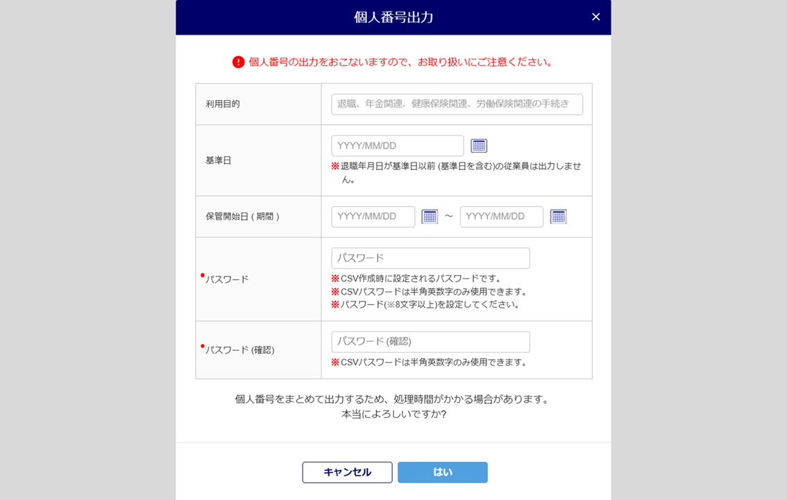 システムに保管している個人番号(マイナンバー)をCSVファイルに出力する方法について、ご説明します。