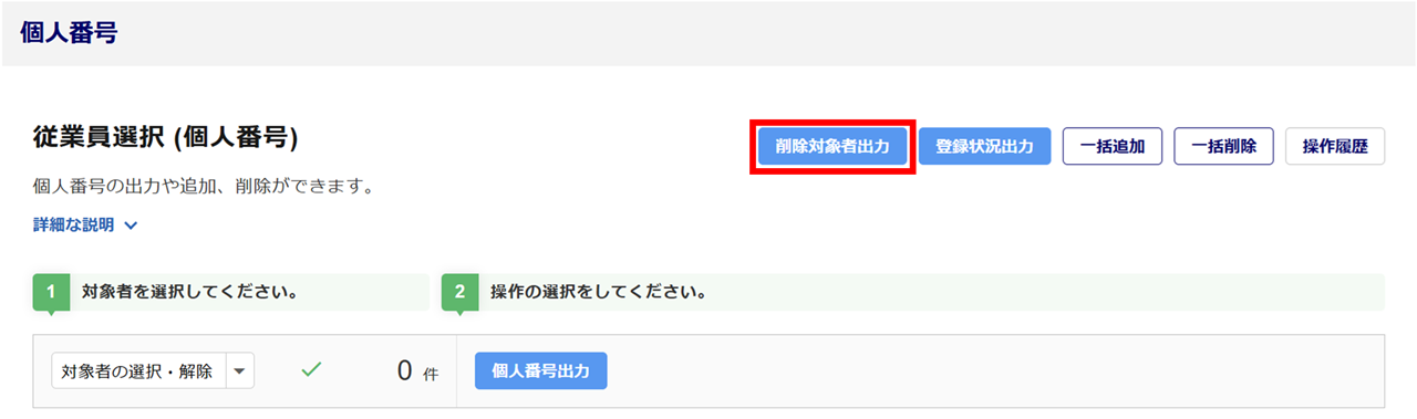 システムに保管している個人番号(マイナンバー)を削除する必要がある対象者をCSVファイルで出力する方法について、ご説明します。