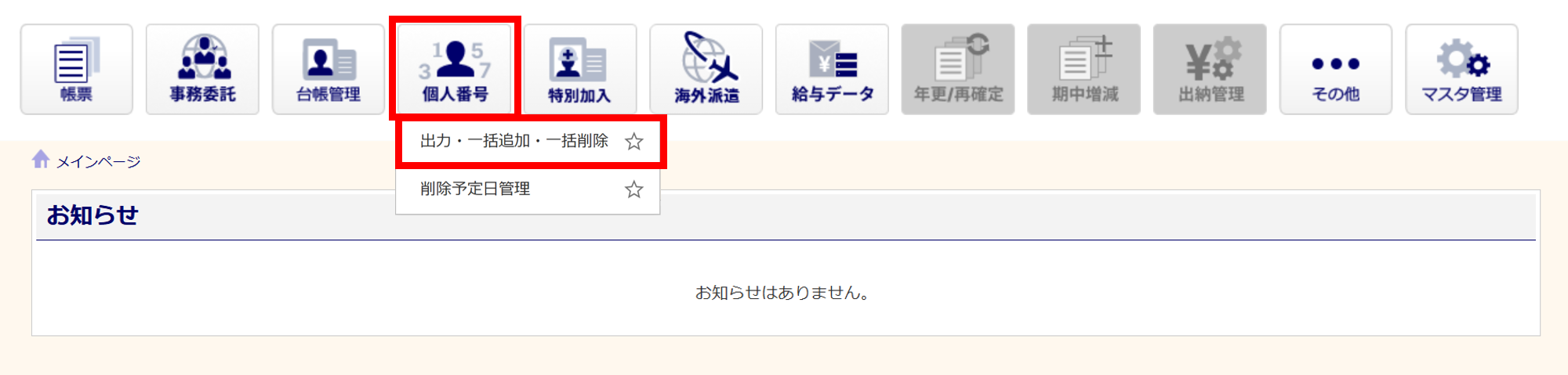 [個人番号]をクリックし、表示されるメニュー内の[出力・一括追加・一括削除]をクリックします。