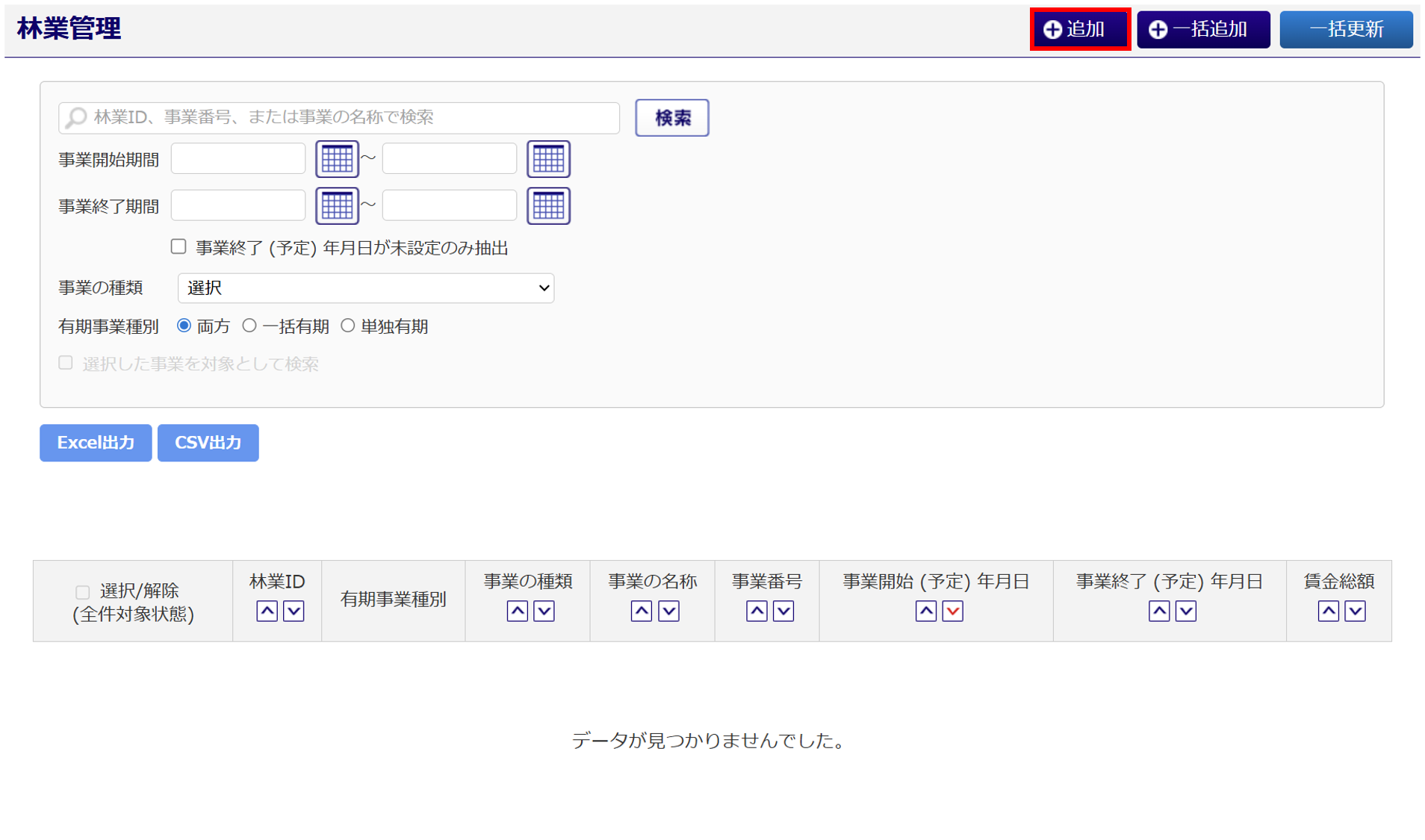 「林業管理」画面が表示されます。画面右上の[追加]をクリックします。