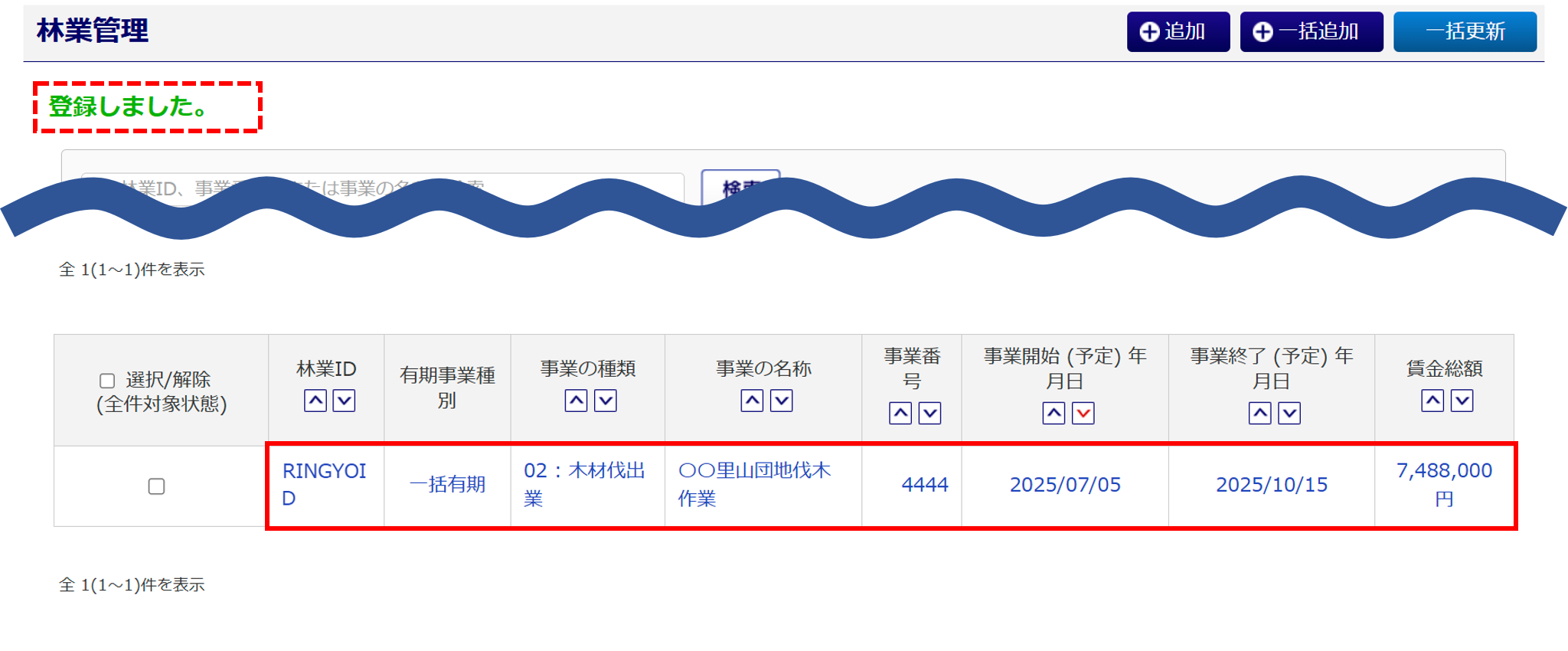 画面上部に「登録しました。」と表示されたら、林業管理の登録は完了です。