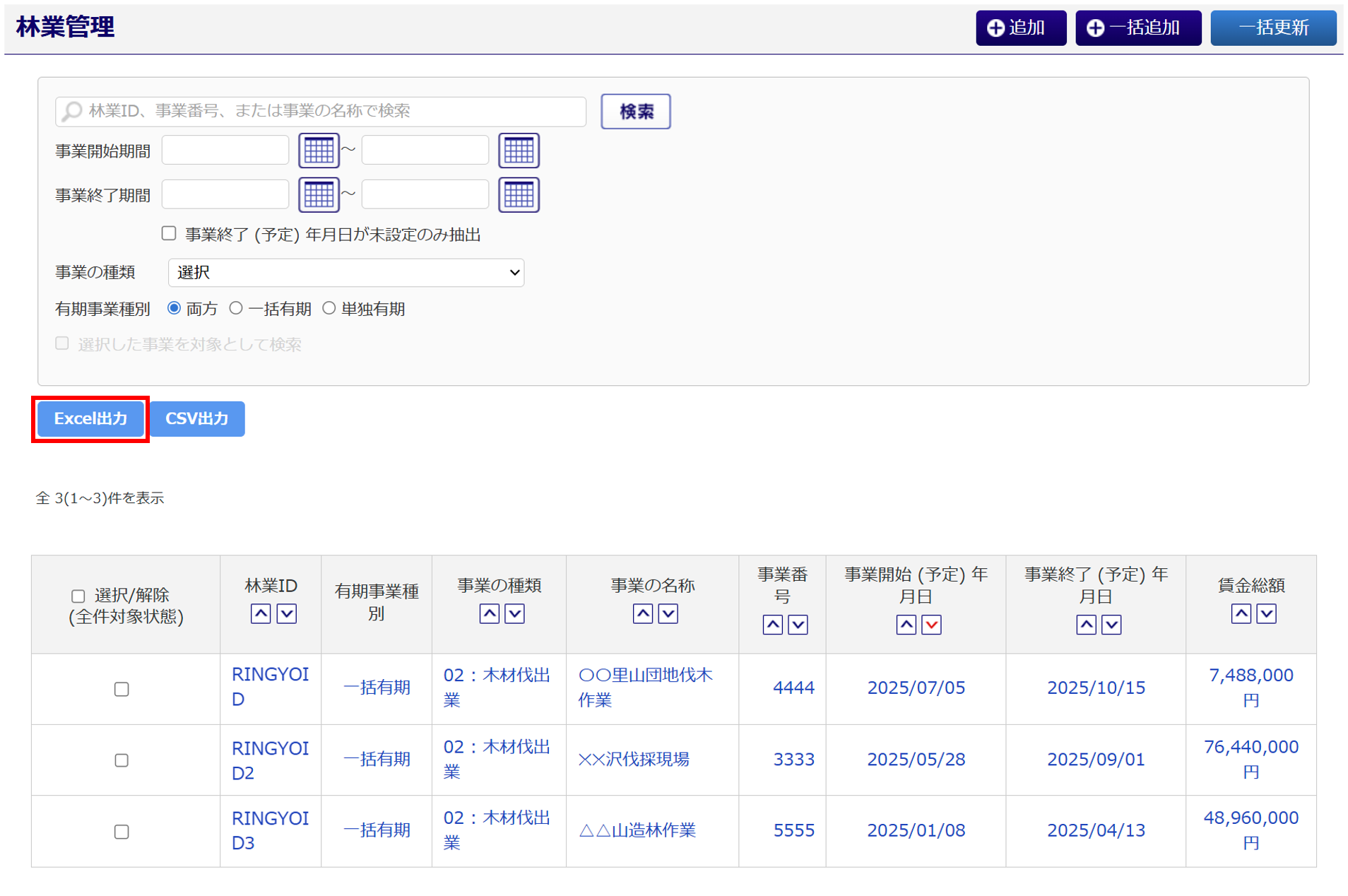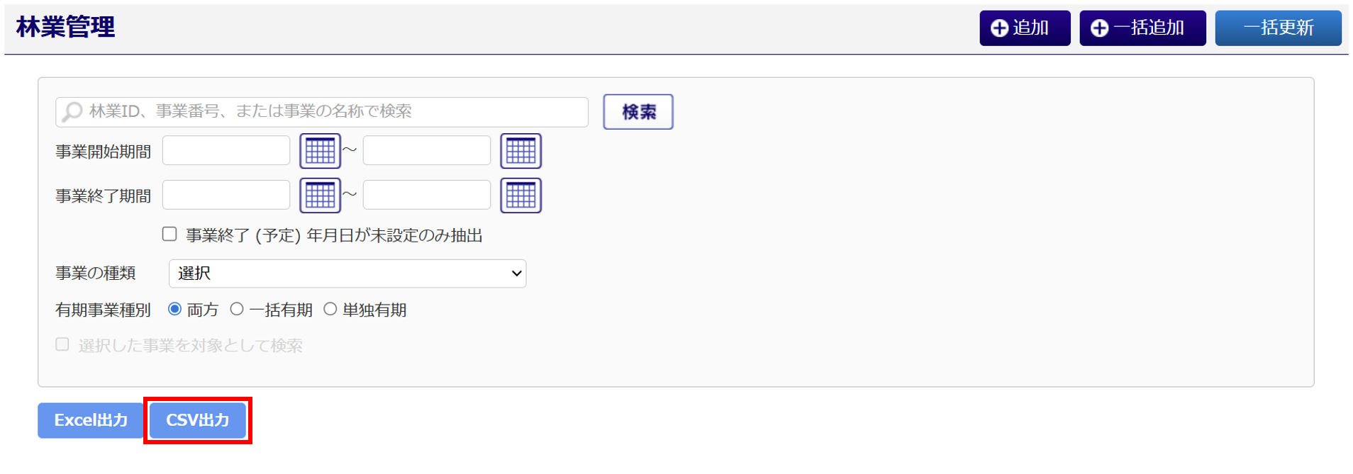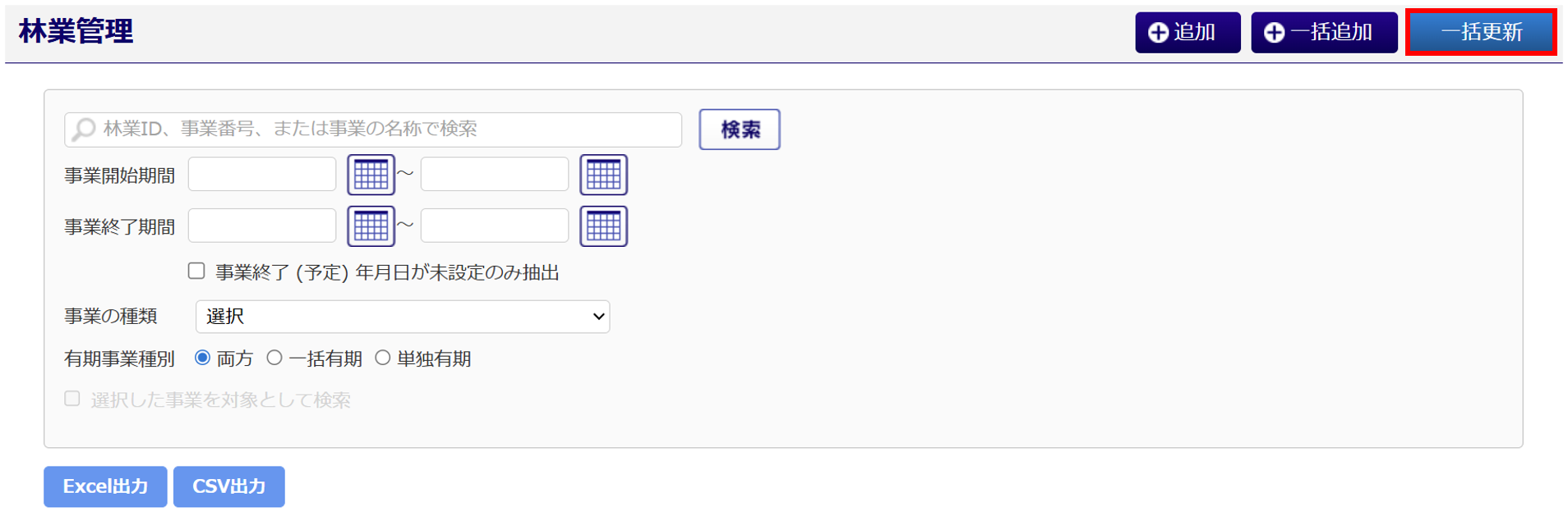 保存後、「林業管理」画面上部の[一括更新]をクリックします。