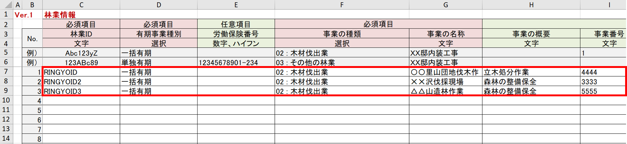 テンプレートファイルに、登録されている林業情報が出力されます。