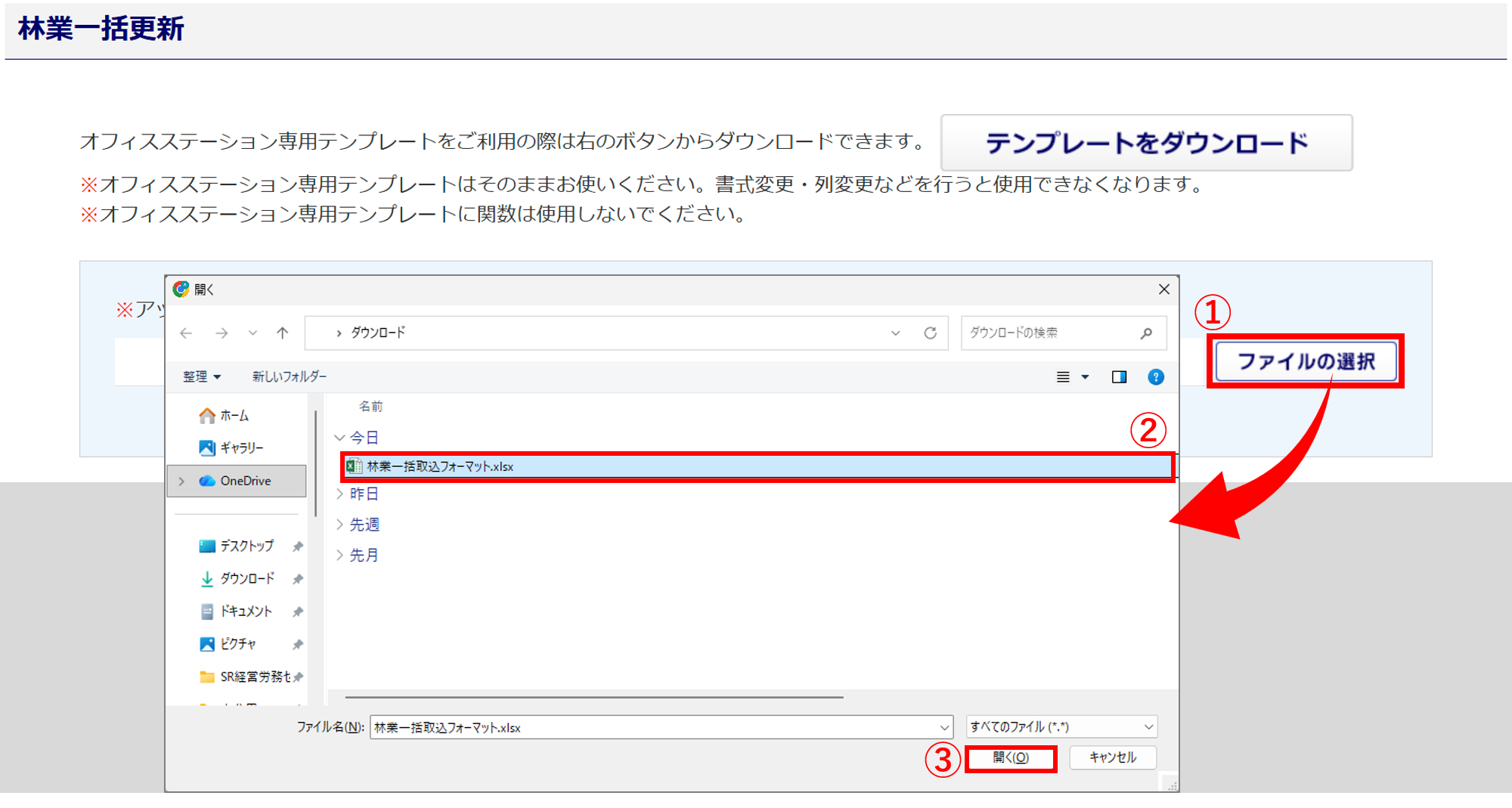 「林業一括更新」画面にて、編集したテンプレートを取り込みます。