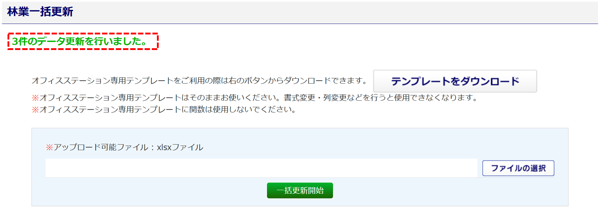 画面上部に「〇件のデータ更新を行いました。」と表示されたら、林業情報の一括更新は完了です。