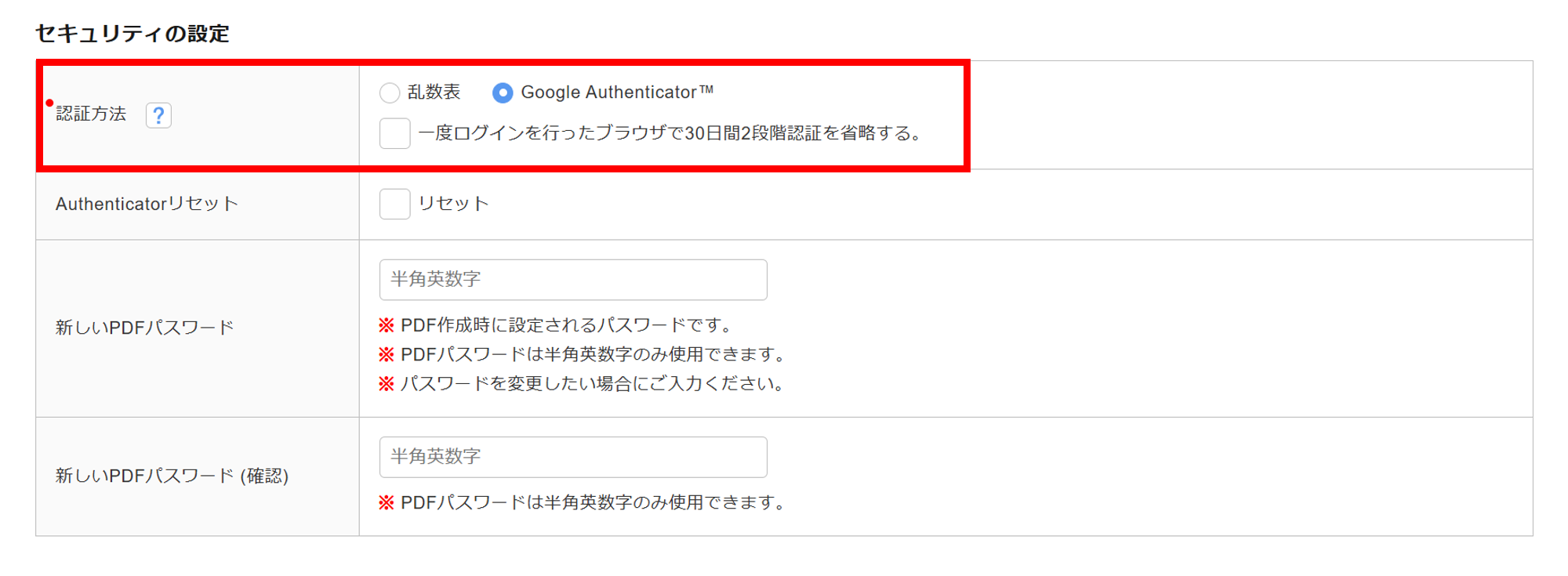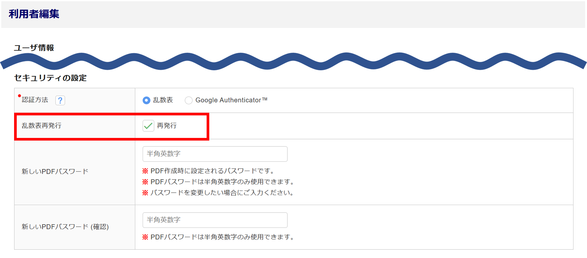 「乱数表再発行」項目は、「認証方法」項目で『Google Authenticator』を選択している場合は、表示されません。