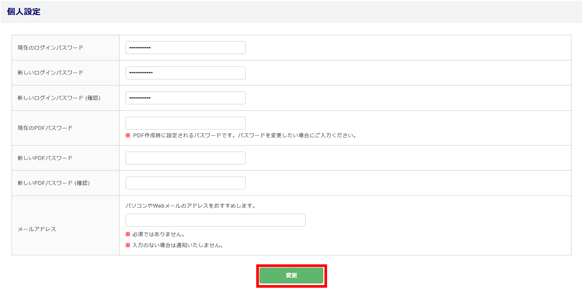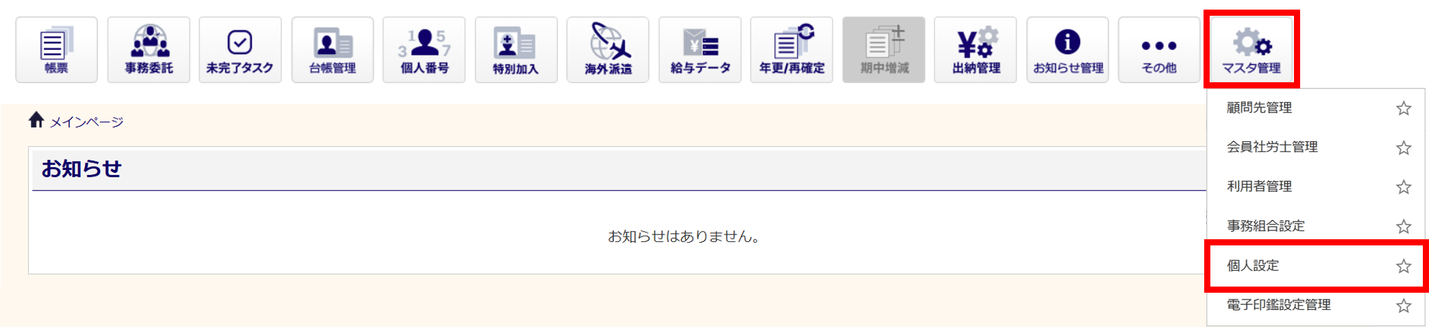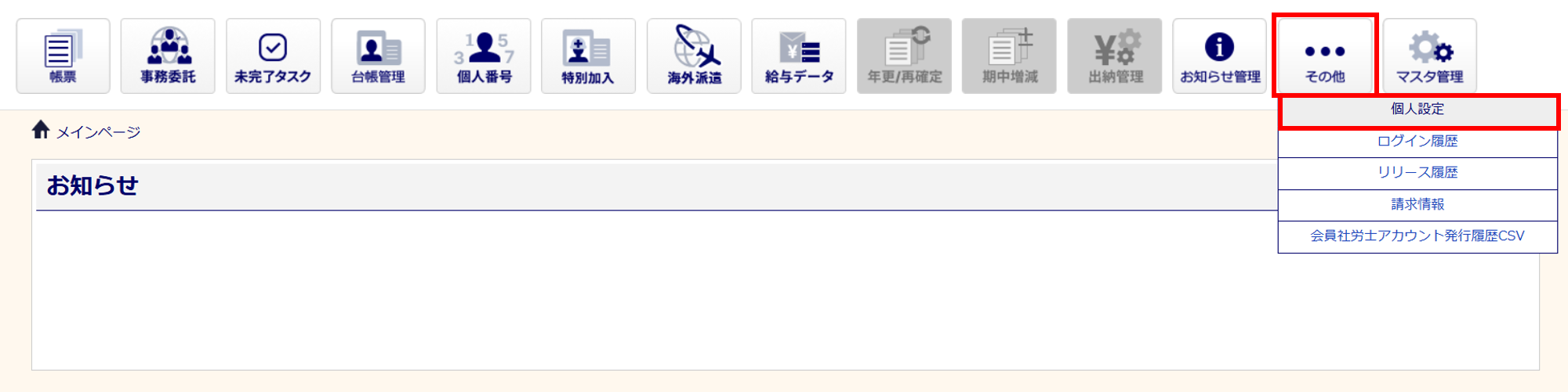 画面上部に「個人設定を変更しました。」と表示されたら、パスワードの変更操作は完了です。