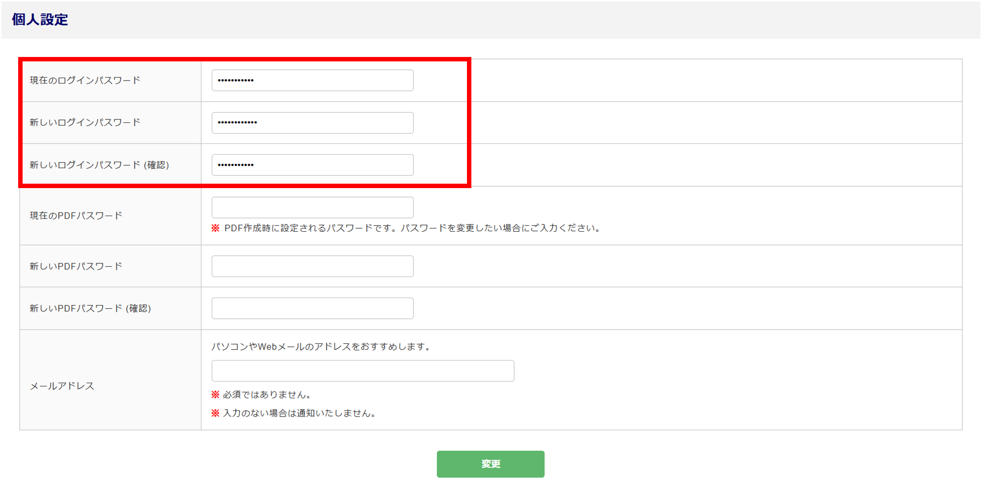 「新しいログインパスワード」項目で入力したパスワードと同じパスワードを入力します。