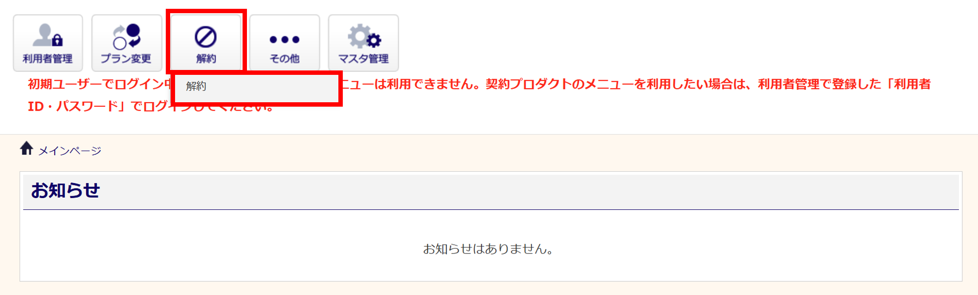 初期ログイン用 」のIDと、パスワードでログインできている場合に限り、システム画面に赤文字で「初期ユーザーでログイン中のため、契約プロダクトのメニューは利用できません。契約プロダクトのメニューを利用したい場合は、利用者管理で登録した「利用者ID・パスワード」でログインしてください。」と表示されています。