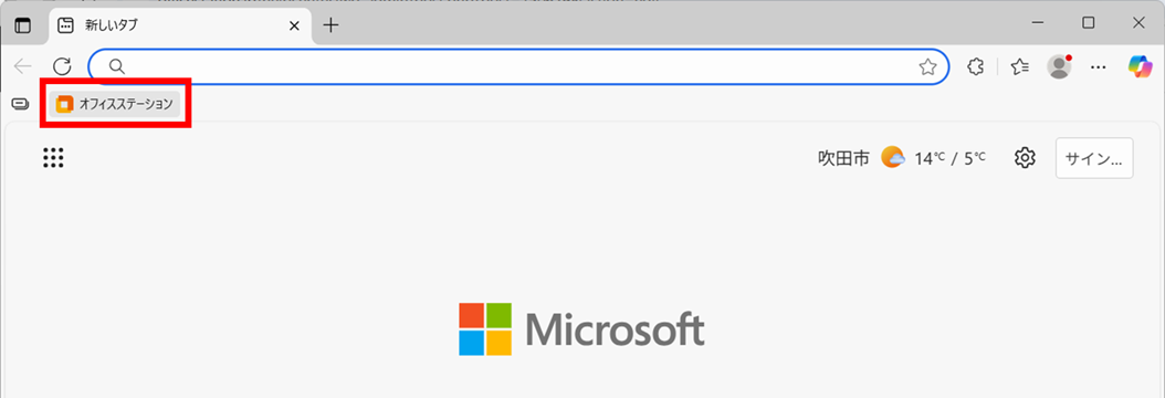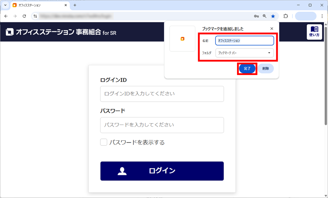 ブックマーク登録後、「オフィスステーション 事務組合 for SR」事務局用システムのログイン画面は、「ブックマーク」をクリックして開くことができます。