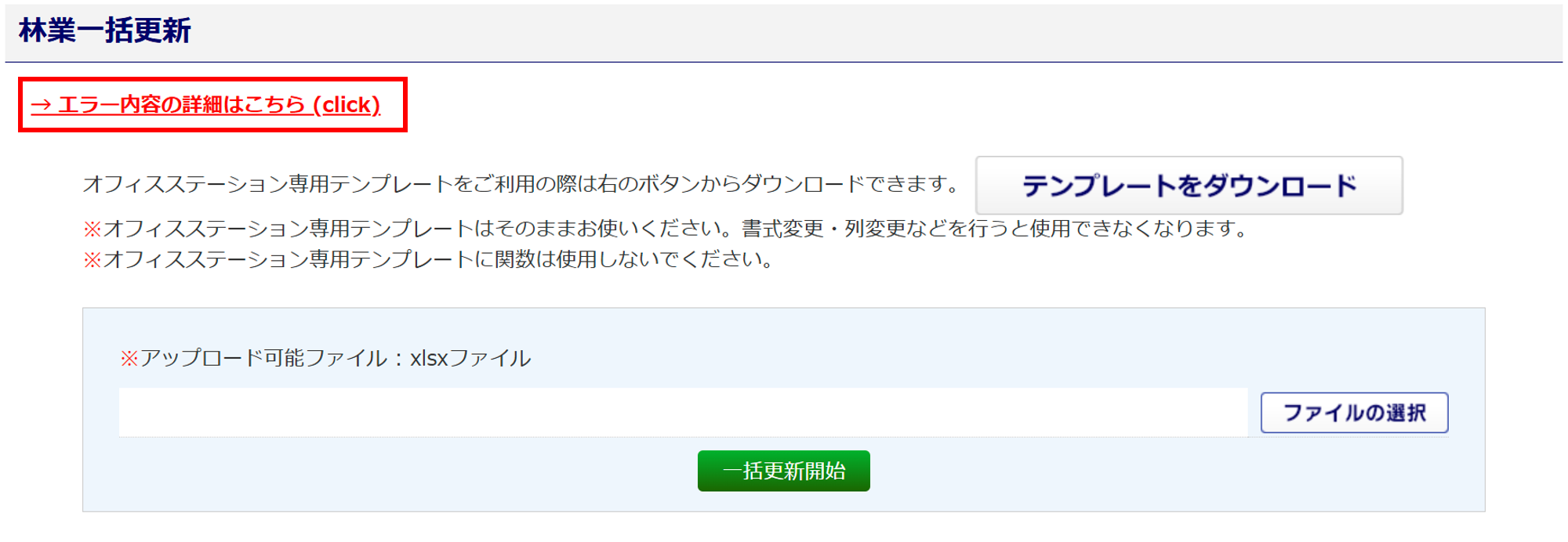 テンプレートの内容に問題がある場合、ファイル取込後、画面上部に「エラー内容の詳細はこちら (click)」と表示されます。「エラー内容の詳細はこちら (click)」をクリックし、エラーの内容を確認および修正後、再度アップロードをおこなってください。