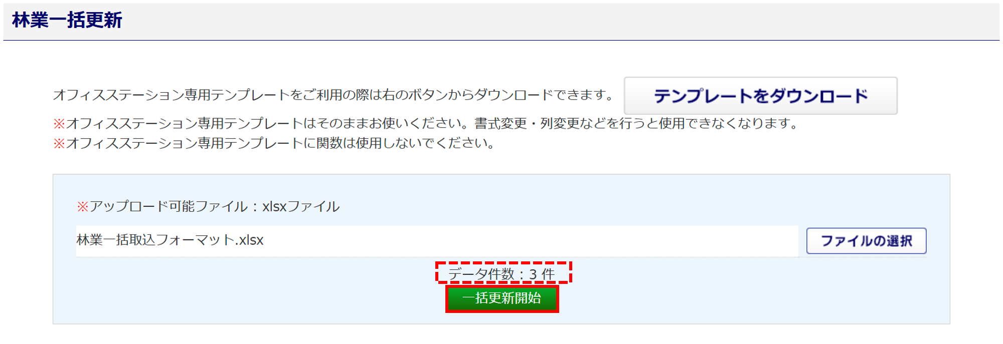 「林業一括更新」画面にて、編集したテンプレートを取り込みます。