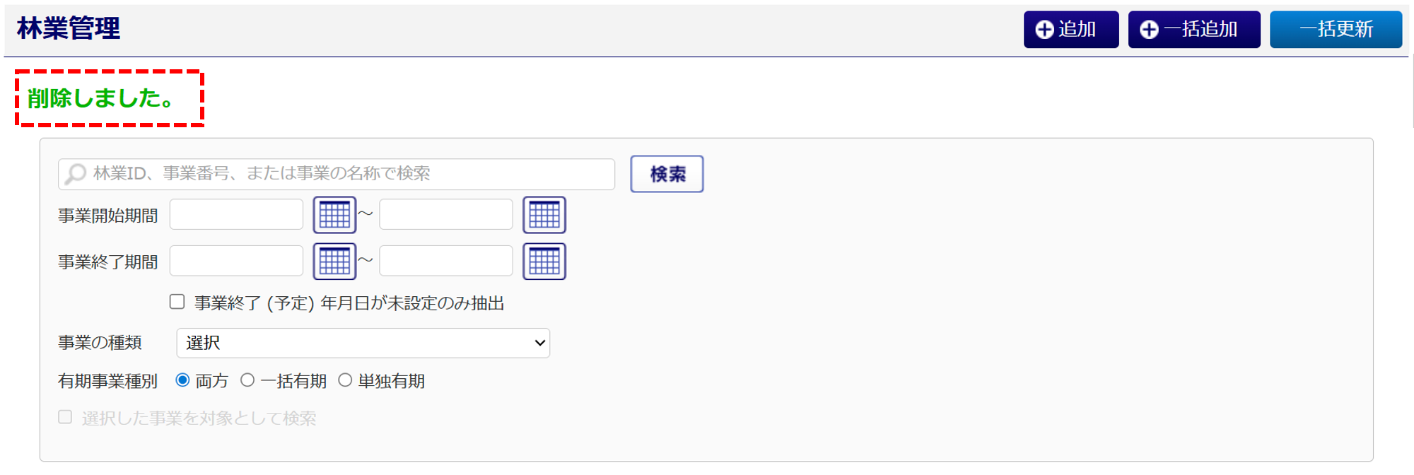 画面上部に「削除しました。」と表示されたら、林業管理の削除は完了です。