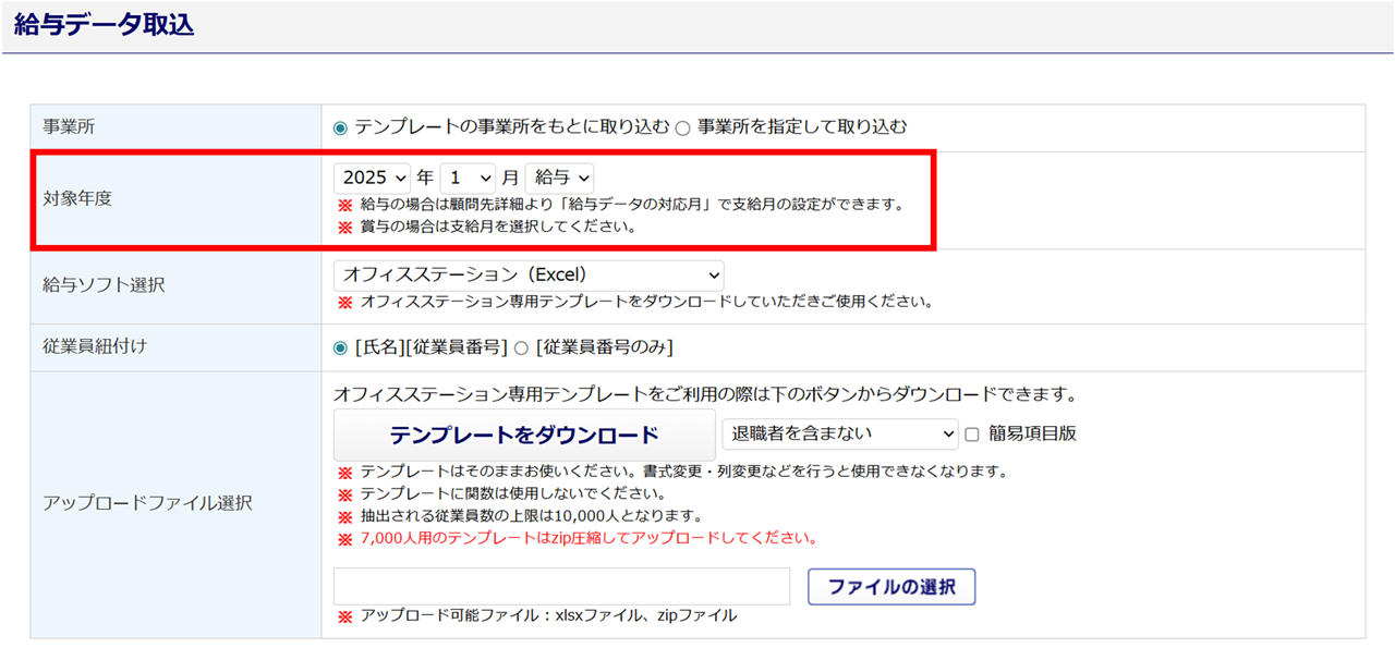 「給与データの対応月」項目にて、『支払日の月』と設定されている必要があります。