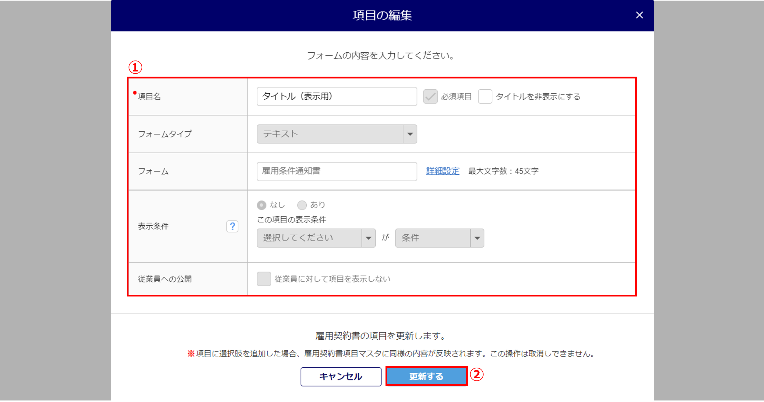 変更する項目の内容(①)を編集し、[更新する](②)をクリックします。