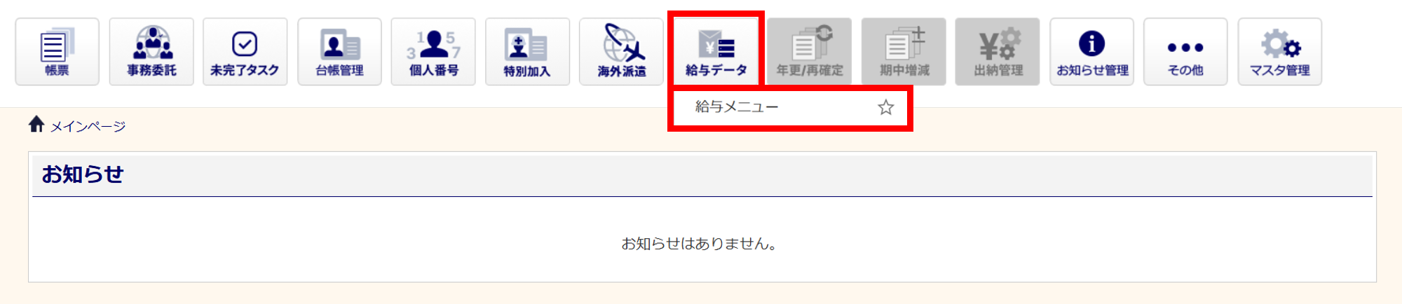 [給与データ]>[給与メニュー]をクリックします。