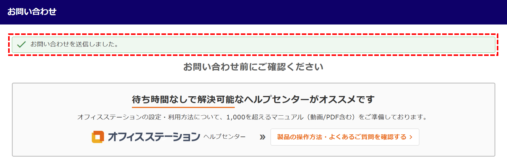 画面上部に「お問い合わせを送信しました。」と表示されたら、お問い合わせ完了です。